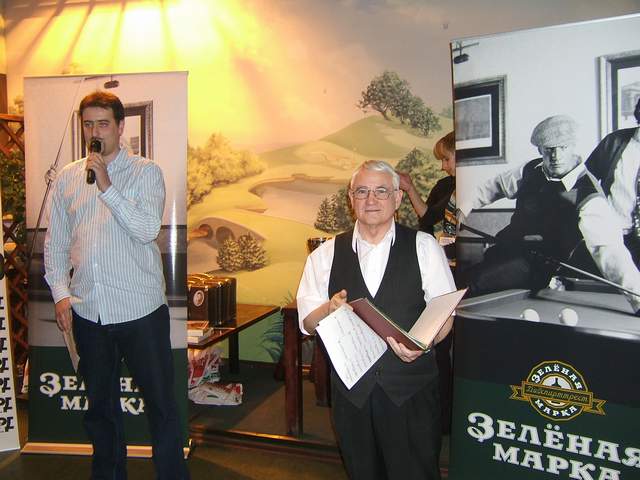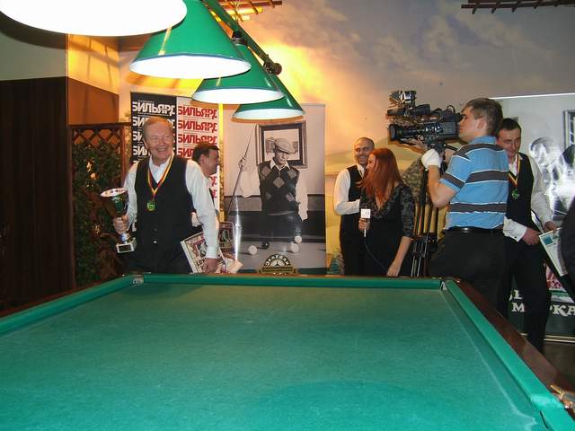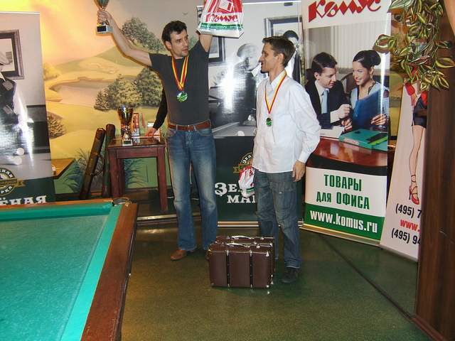 Участники турнира показали высокий класс игры, многие из них могли бы не плохо смотреться и на первенстве Москвы среди спортсменов. Всё это говорит о популярности русского бильярда в России и о том, что общий уровень игры любителей бильярда постепенно поднимается и количество естественно переходит в качество. Украшением турнира, безусловно, явились игры на заключительной стадии. В финале полное превосходство над соперником продемонстрировал заместитель Генерального директора компании "Сален" Цигельников Евгений. За третье место сражались Романов Александр из "Российского союза поставщиков металлопродукции" и Павел Черемисин. В контровой партии Павел был удачлевее своего соперника и одержал победу. В заключении организаторы турнира наградили его участников многочисленными подарками. Итоговый протокол (формат Word), Таблица турнира (формат Excel) ![]() ![]() ![]() ![]() ![]() ![]() ![]() ![]() |