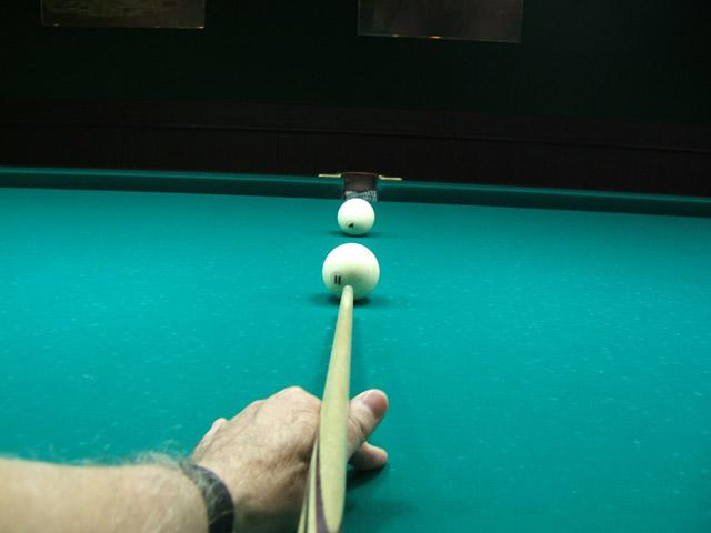 Весьма важным при этом является стабильное маховое движение кия по линии прицеливания, которым должен овладеть игрок, и удар по битку наклейкой кия.