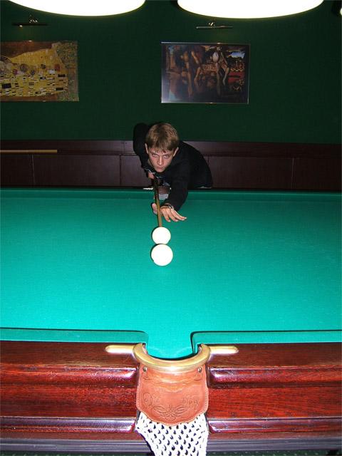 - Встаём фронтально к линии прицеливания. Почему? Это положение позволяет наиболее естественно и без напряжения совместить в одну плоскость кисть, локоть и плечо маховой руки. При этом кисть маховой руки (равносильно - турник кия) более стабильно может двигаться в плоскости прицеливания.